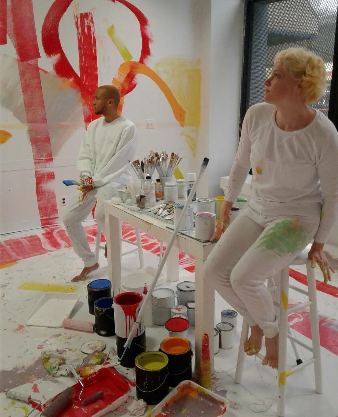 The two artists took turns, creating one mark per turn. For each artist the choice of material, and tool will be made by the other artist. During a turn, one artist considered what they would like the next mark to be, prepared a tool (example, load a paintbrush with paint), then hand it to the other artist to create the mark.